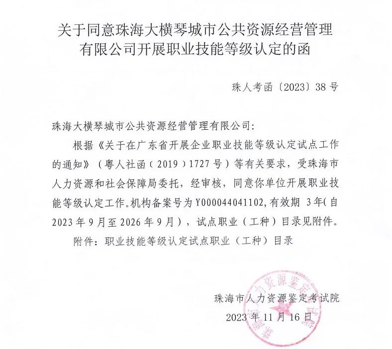 通過該項備案申請后,當前,大橫琴城資可面向公司職工組織開展職業(yè)技能等級認定工作,包括評價規(guī)范的制定、評價的方式、指標的設定、具體的實施、認定公示和證書的核發(fā)等。