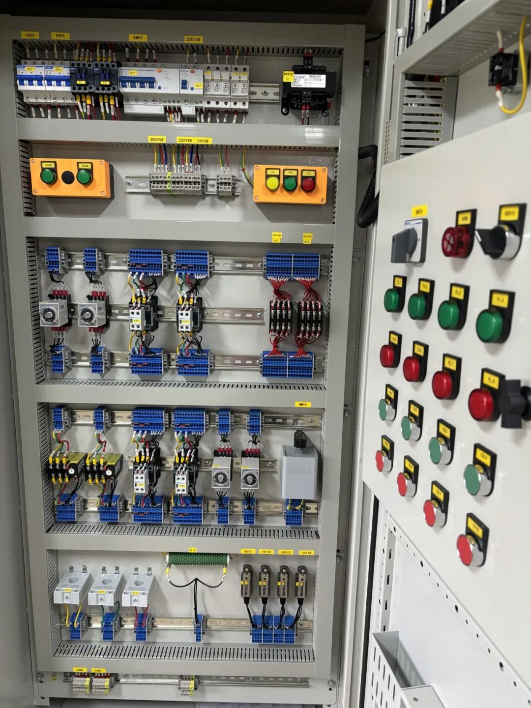 培訓室內(nèi)配套設置了4臺PLC教學版智能自動控制模板、4臺成品動力柜、4臺成品照明柜、4套直流電機調(diào)速控制線路、5套三相電機正反轉(zhuǎn)接線設備、5套三相水泵浮球控制設備及各種適用于初級、中級機電認證高端設備。未來,該培訓室將開放給公司機電業(yè)務線條員工日常訓練使用,有助于員工培養(yǎng)“執(zhí)著專注、精益求精、追求進步”的工匠精神。