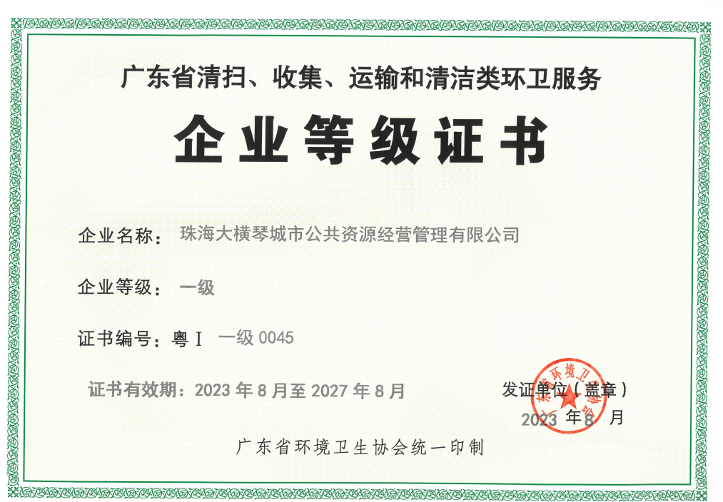 2023年,大橫琴城資榮獲“廣東省清掃、收集、運輸和清潔類環(huán)衛(wèi)服務企業(yè)”一級評定和珠海市“十佳環(huán)衛(wèi)(垃圾分類)企業(yè)”稱號。