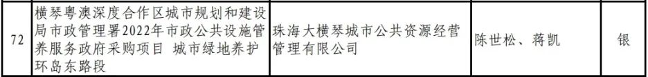 喜訊,2023年度,廣東省風(fēng)景園林與生態(tài)景觀協(xié)會(huì)科學(xué)技術(shù)獎(jiǎng)(園林工程獎(jiǎng))評(píng)選日前落幕,珠海大橫琴城市公共資源經(jīng)營(yíng)管理有限公司(以下簡(jiǎn)稱大橫琴城資)管養(yǎng)的橫琴粵澳深度合作區(qū)城市規(guī)劃和建設(shè)局市政管理署2022年市政公共設(shè)施管養(yǎng)服務(wù)政府采購(gòu)項(xiàng)目——城市綠地養(yǎng)護(hù)環(huán)島東路段榮獲養(yǎng)護(hù)類銀獎(jiǎng)。